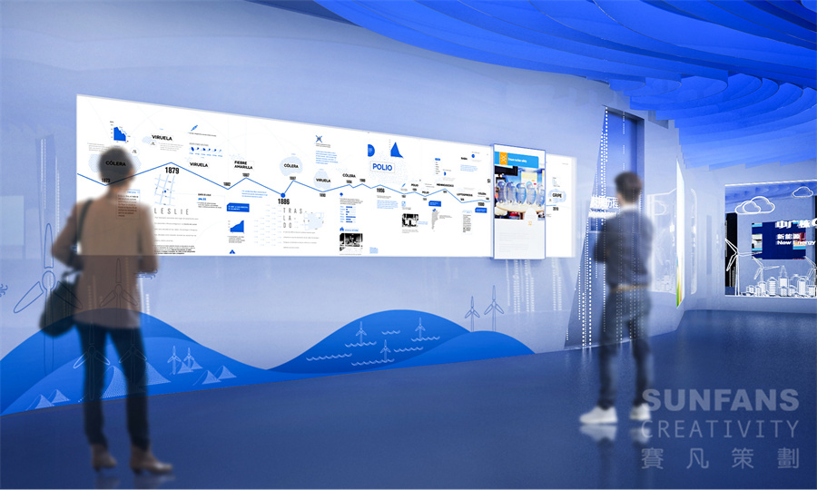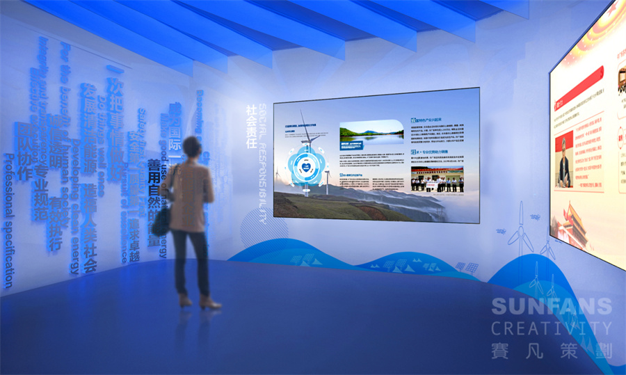 展廳設(shè)計(jì)立足中廣核集團(tuán)傳播基礎(chǔ),通過(guò)展現(xiàn)中廣核集團(tuán)及新能源公司的發(fā)展歷程、業(yè)務(wù)布局及核心成果,突出新能源公司堅(jiān)持不懈、勇于開拓、敢于擔(dān)當(dāng)?shù)母镄戮瘛?