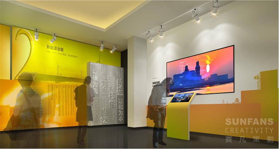 整個(gè)展廳以“合”與“+”作為設(shè)計(jì)元素,意寓著百尺竿頭更進(jìn)一步,將“+”、自然環(huán)保、核電、智慧型城市等元素以畫(huà)卷的形式呈現(xiàn)在形象墻上,烘托國(guó)家核電的發(fā)展理念,為整個(gè)展廳奠定了整個(gè)基調(diào)。