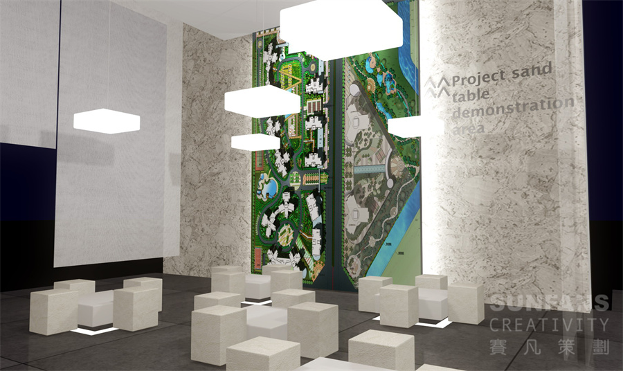 我們以“浮動的空間”為設(shè)計主題,將功能區(qū)分為兩大部分,分別為感觸式空間和感知式空間,通過感觸和感知空間的合理規(guī)劃來創(chuàng)造出一個理性的空間感受。感觸空間是一個個懸浮于銷售處空間內(nèi)的半透明體驗室,受眾將通過自身的身體感觸體驗來了解樓體新技術(shù)的應(yīng)用。感知空間需要穿插于公共空間內(nèi)并與公共空間融為一體,受眾通過圖文及交互式觸摸技術(shù)了解其他新型環(huán)保技術(shù)。