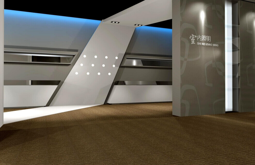 對展廳設計空間而言,空間界面展廳設計應具有一定的視覺指示性和方位的導向性。這樣會使展示空間更加有序,空間流線更加清晰。頂棚的造型與展臺的造型交相呼應,一方面增強了空間的領域性,另一方面加強了視覺指示性,
