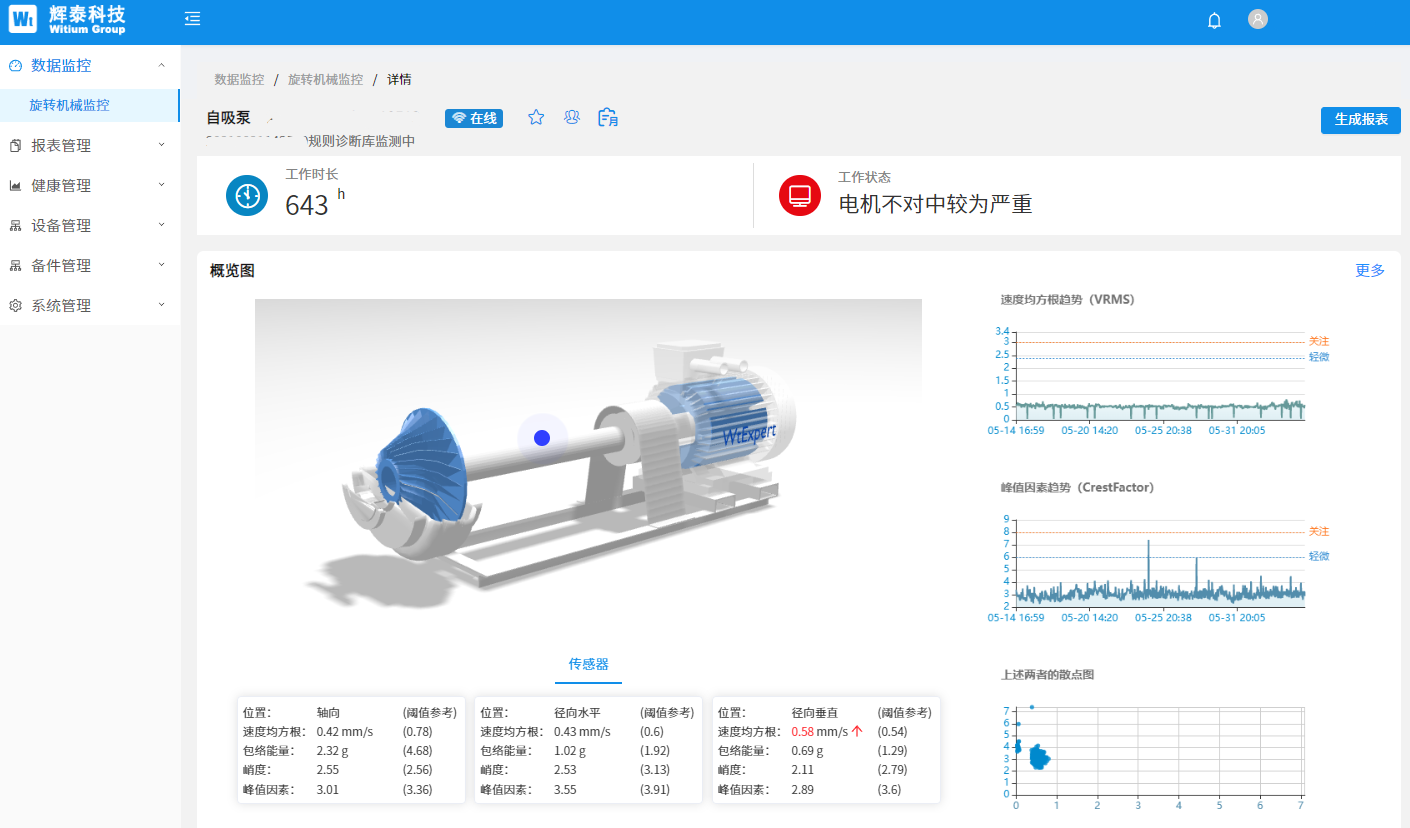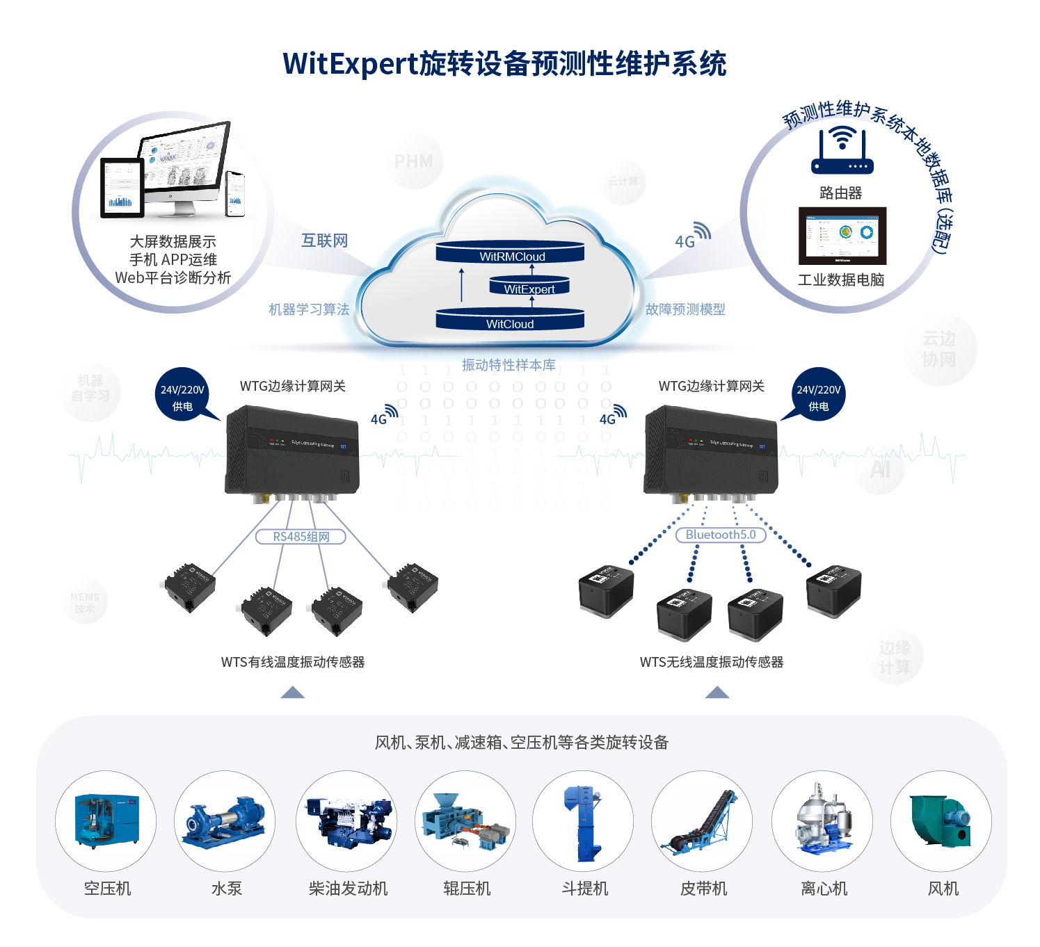 空壓機(jī)故障預(yù)測(cè)解決方案利用物聯(lián)網(wǎng)高頻振動(dòng)傳感器,采集設(shè)備振動(dòng)波形樣本及表面溫度,生成空壓機(jī)設(shè)備的振動(dòng)特性樣本;邊緣計(jì)算網(wǎng)關(guān)通過(guò)鉑電阻采集空壓機(jī)三相繞組溫度和潤(rùn)滑油溫度,了解空壓機(jī)運(yùn)行負(fù)載狀態(tài)并結(jié)合傳感器的振動(dòng)特性,利用智能機(jī)理模型算法對(duì)采樣數(shù)據(jù)進(jìn)行大數(shù)據(jù)分析,實(shí)現(xiàn)不平衡、不對(duì)中、松動(dòng)、齒輪磨損、軸承老化等空壓機(jī)設(shè)備故障的預(yù)測(cè);然后通過(guò)MQTT把數(shù)據(jù)樣本及分析學(xué)習(xí)結(jié)果上傳到WitCloud物聯(lián)網(wǎng)數(shù)據(jù)云平臺(tái);解決方案的SaaS業(yè)務(wù)云平臺(tái)為用戶提供狀態(tài)監(jiān)控、場(chǎng)景監(jiān)控、故障管理、運(yùn)維管理、設(shè)備管理、客戶管理、權(quán)限管理等功能;并提供數(shù)據(jù)接口功能,方便用戶把設(shè)備狀態(tài)導(dǎo)入到智能工廠運(yùn)維平臺(tái)系統(tǒng)。同時(shí)業(yè)務(wù)云平臺(tái)通過(guò)大數(shù)據(jù)分析工具,為專業(yè)的用戶提供空壓機(jī)設(shè)備的運(yùn)行狀態(tài)分析、預(yù)警故障分析,并形成專業(yè)的空壓機(jī)設(shè)備健康診斷報(bào)告和維修建議。