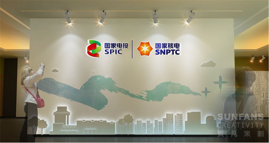 整個(gè)展廳以“合”與“+”作為設(shè)計(jì)元素,意寓著百尺竿頭更進(jìn)一步,將“+”、自然環(huán)保、核電、智慧型城市等元素以畫(huà)卷的形式呈現(xiàn)在形象墻上,烘托國(guó)家核電的發(fā)展理念,為整個(gè)展廳奠定了整個(gè)基調(diào)。