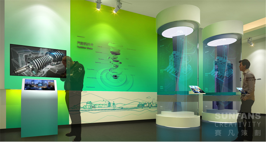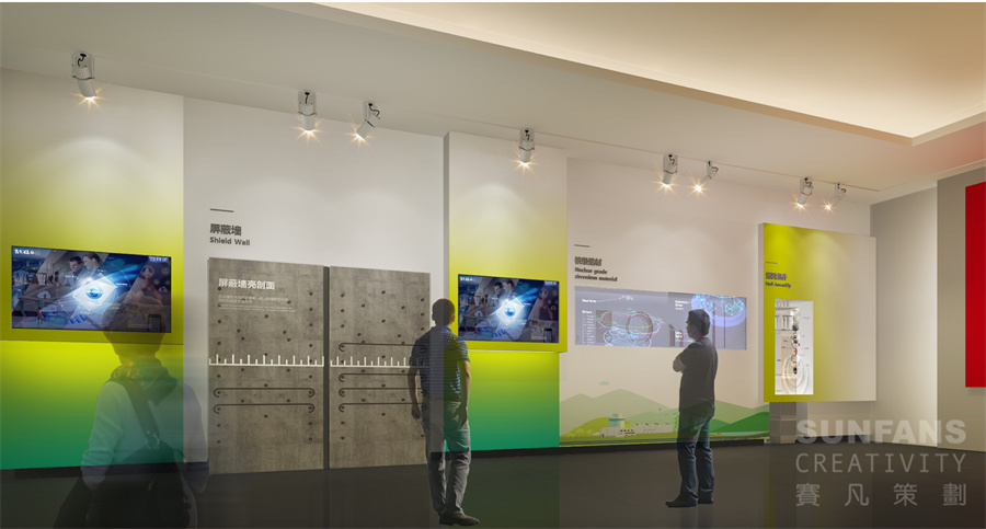 賽凡此次設(shè)計(jì)以國(guó)家核電的各項(xiàng)業(yè)務(wù)作為主要內(nèi)容進(jìn)行展示,多媒體技術(shù)的應(yīng)用增強(qiáng)了展項(xiàng)的互動(dòng)性,能使觀眾身臨其境地感受到國(guó)家核電的企業(yè)氛圍。展廳整體以溫暖積極的黃色作為基礎(chǔ)色調(diào),配合代表清潔環(huán)保的綠色,營(yíng)造了鮮明簡(jiǎn)介的企業(yè)特征,易于給觀眾留下深刻印象。
