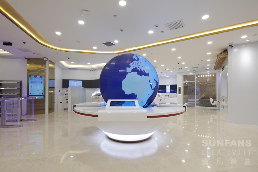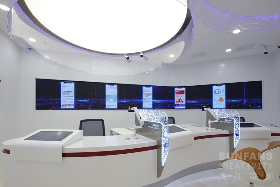 賽凡設計團隊根據5G概念為契機,從空間布局,多媒體技術融合應用及地域文化特色展示等方面進行整體方案設計,突破傳統(tǒng)網點形象,打造富有科技感的5G+文旅主題場景的銀行網點,塑造全新的銀行品牌形象,擴大了品牌影響力。