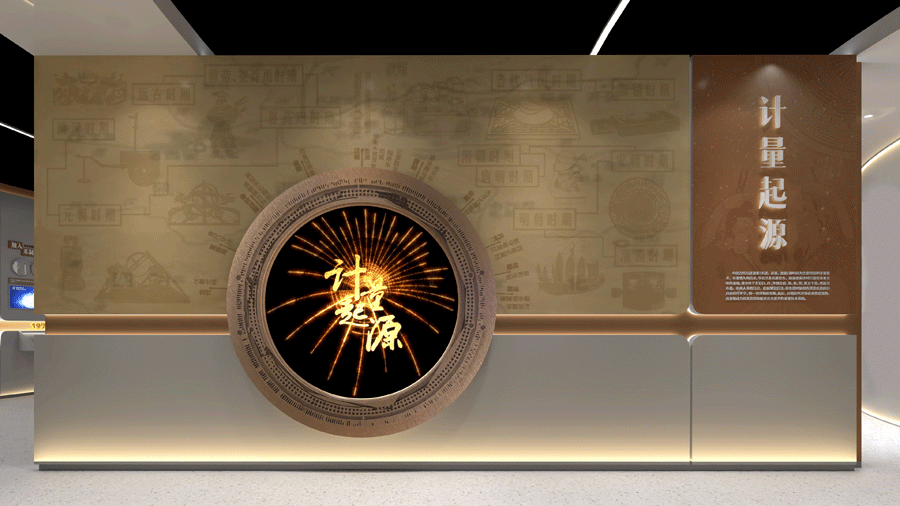 展館的序幕,從計量的起源緩緩拉開。中華古往今來的計量文化,如同一幅幅歷史畫卷,訴說著計量的本質(zhì)與重要作用。墻面設(shè)計上,不同歷史時期的計量發(fā)明被精心挑選,化作一幅幅生動的背景畫面,而中央則鑲嵌著一枚日晷造型的圓形觸控屏。觀眾只需輕輕一觸,便能穿越時空,點選不同的歷史時期,借助先進(jìn)的結(jié)構(gòu)投影技術(shù),背景墻上便會上演一幕幕對應(yīng)的計量發(fā)明與文化故事,讓人仿佛置身于那段輝煌的歷史之中。