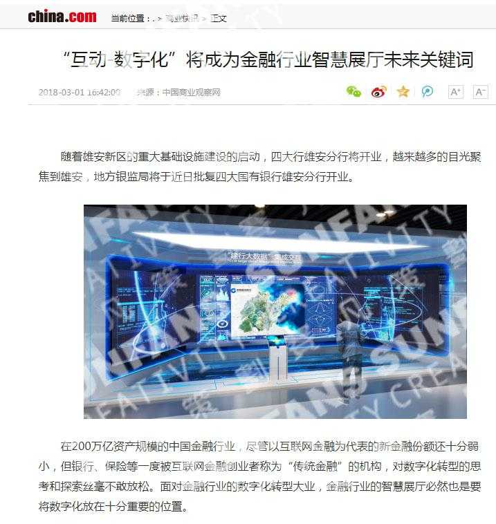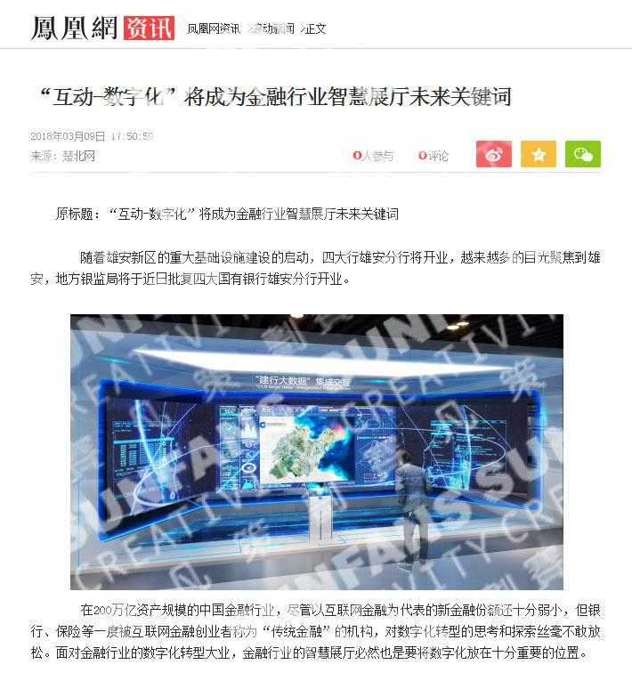 賽凡多年來在展廳設(shè)計(jì)建造方面,一直堅(jiān)持以“作品”為核心,用作品說話的初心,深耕于金融、核電行業(yè)多年。日前,中華網(wǎng)、鳳凰網(wǎng)等各大門戶網(wǎng)站相繼刊登了一篇名為《“互動(dòng)-數(shù)字化”將成為金融行業(yè)智慧展廳未來關(guān)鍵詞》的文章。
