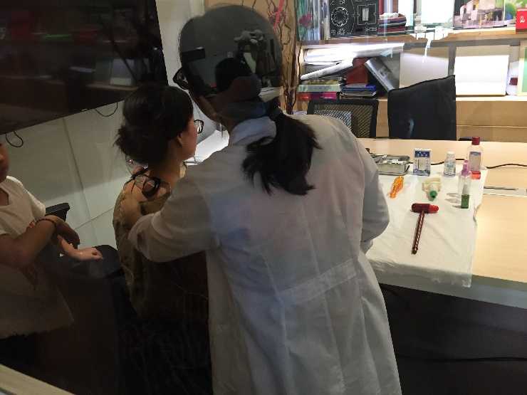 丁大夫為我們的人事經(jīng)理進(jìn)行“放血拔罐”,目的是緩解她頸椎的疼痛問題
