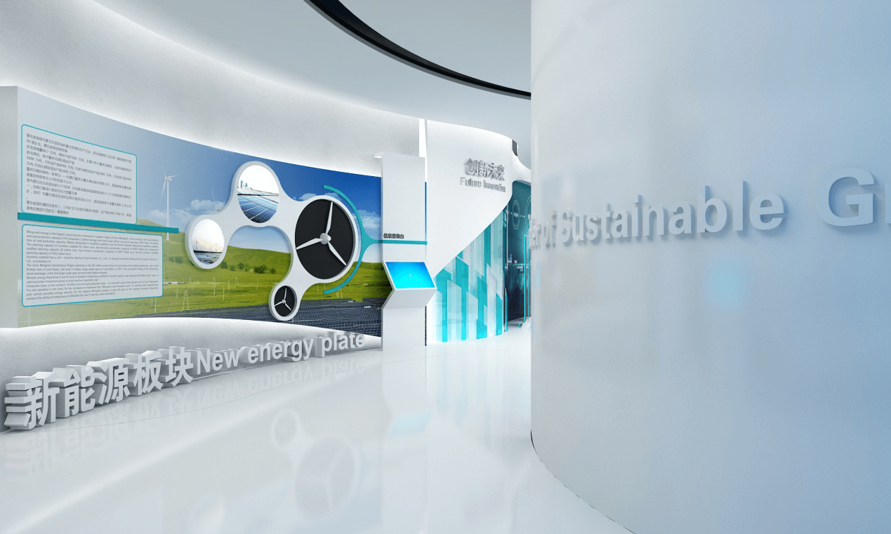 展館以“用智慧鏈通能源” 為題,突出經(jīng)濟(jì)循環(huán)一體化的概念,布局結(jié)構(gòu)中運(yùn)用循環(huán)、整體的概念,空間開闊、流暢,跟隨參觀,企業(yè)特性自然呈現(xiàn)。
