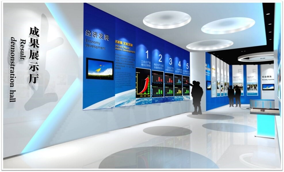 內(nèi)部展示區(qū)域與外部裝修風(fēng)格保持統(tǒng)一,成果展示廳中藍(lán)色背景墻的形式展現(xiàn)烏魯木齊節(jié)流閥去這些年的經(jīng)濟發(fā)展,用圖片文字形式進(jìn)行展示,頂部的原型照明燈讓展廳內(nèi)部的光線更加舒服。