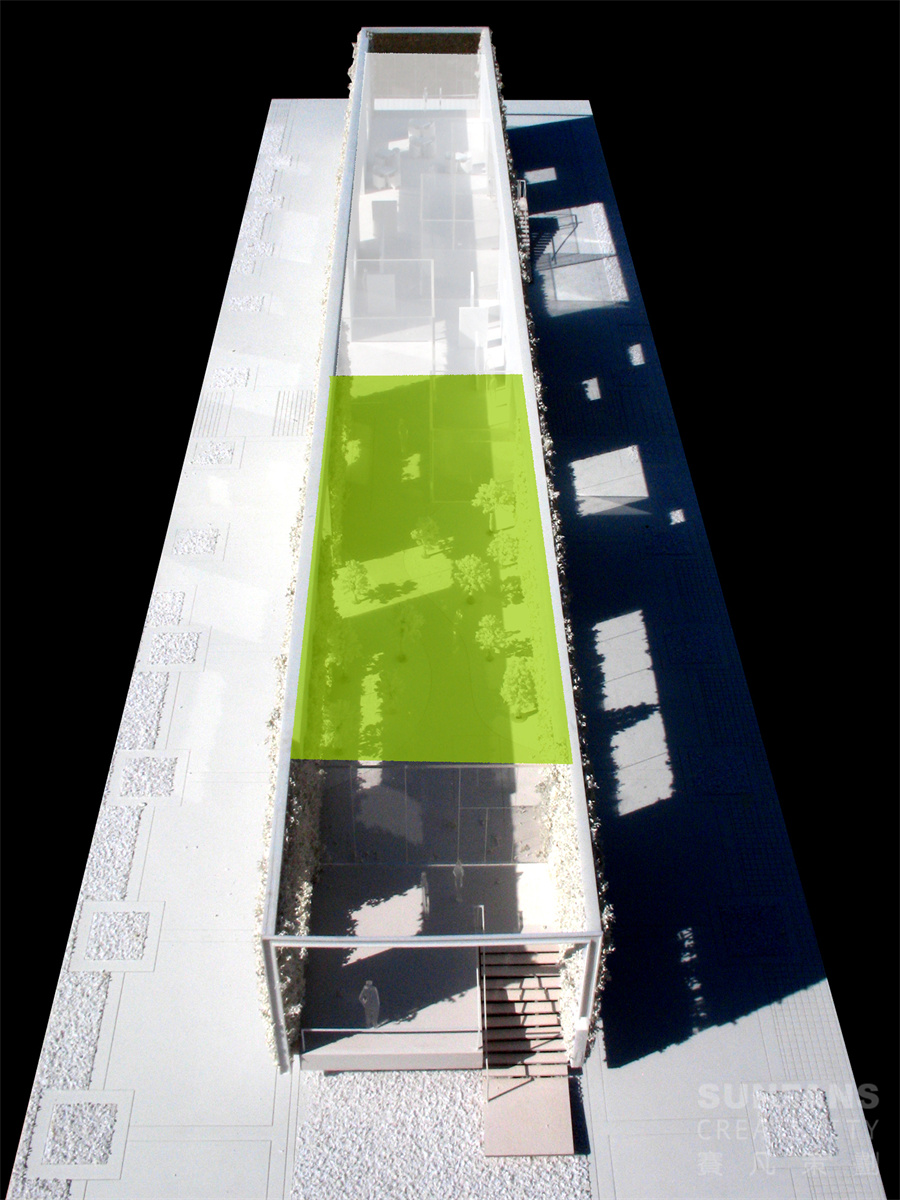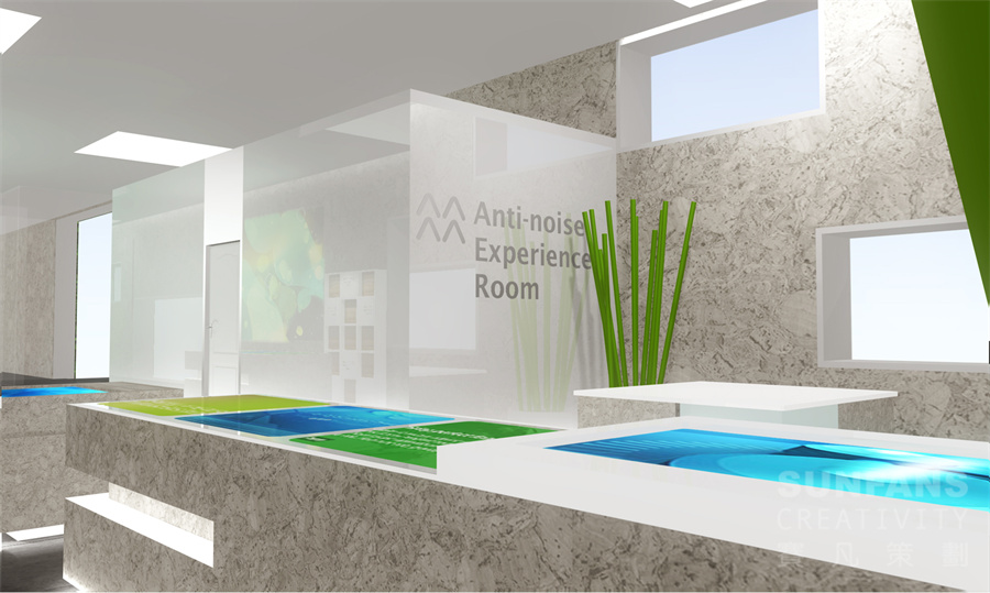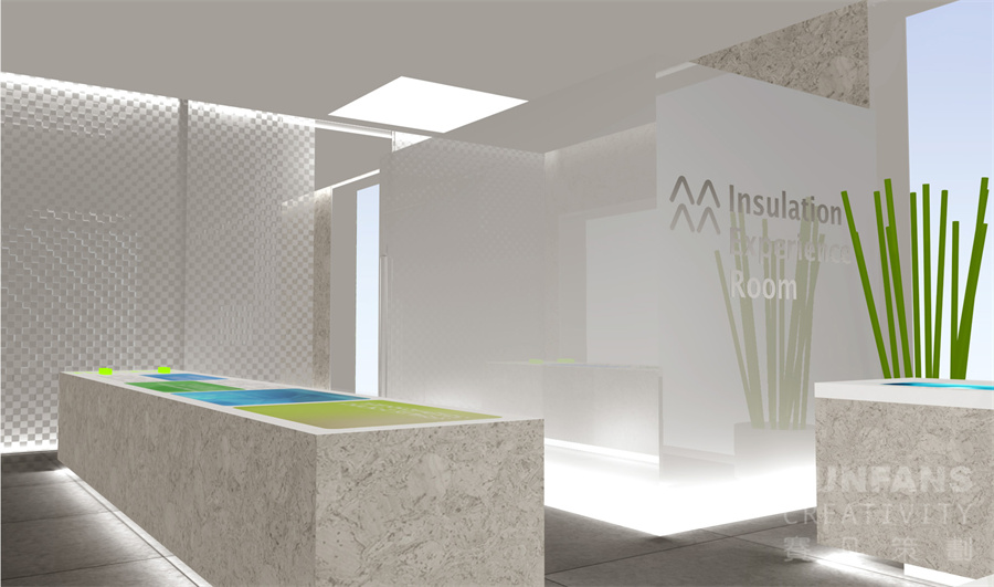 我們以“浮動的空間”為設(shè)計主題,將功能區(qū)分為兩大部分,分別為感觸式空間和感知式空間,通過感觸和感知空間的合理規(guī)劃來創(chuàng)造出一個理性的空間感受。感觸空間是一個個懸浮于銷售處空間內(nèi)的半透明體驗室,受眾將通過自身的身體感觸體驗來了解樓體新技術(shù)的應(yīng)用。感知空間需要穿插于公共空間內(nèi)并與公共空間融為一體,受眾通過圖文及交互式觸摸技術(shù)了解其他新型環(huán)保技術(shù)。