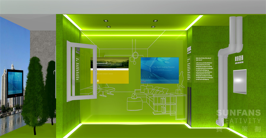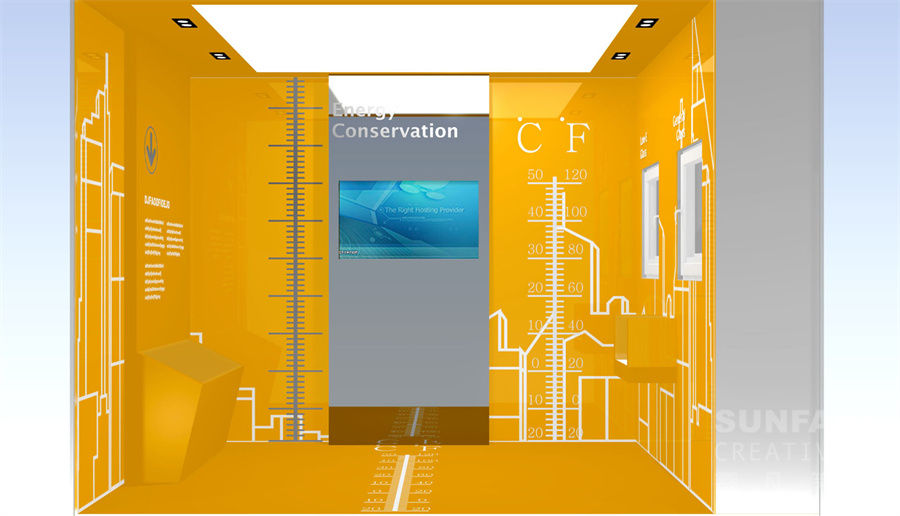 簡約的現(xiàn)代派風(fēng)格,純凈的空間視覺體驗,通過結(jié)構(gòu)和燈光設(shè)計使原本根植于地面的物體浮動起來,枯燥的空間頓時活靈活現(xiàn)起來。半透明的玻璃材料結(jié)合燈光盒子內(nèi)部的人影映射在墻面上,呈現(xiàn)出虛幻的影像。為了在保持空間美感的同時滿足內(nèi)容展示的需要,我們在主觀視覺空間“墻面”并沒有常規(guī)的展示內(nèi)容,而是在視覺空間以下我們設(shè)計了懸浮的盒子來展示我們需要傳達(dá)給受眾的技術(shù)內(nèi)容,當(dāng)然還有漂浮的體驗空間。