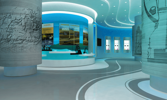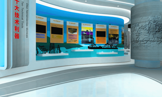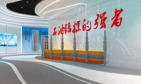 渤海企業(yè)展廳設(shè)計緊扣渤海鉆探企業(yè)文化特色亮點,以流水之韻律,科技之創(chuàng)新、國學(xué)之大雅為理念確定展廳整體風(fēng)格,色彩上以藍、白為主基調(diào),造型上增添曲面柔化,力圖體現(xiàn)“科學(xué)指引”和“鍛造杰出”的企業(yè)形象特征。企業(yè)展廳設(shè)計內(nèi)容上以“創(chuàng)新發(fā)展鑄輝煌”作為核心,突出要點,突顯企業(yè)要素。