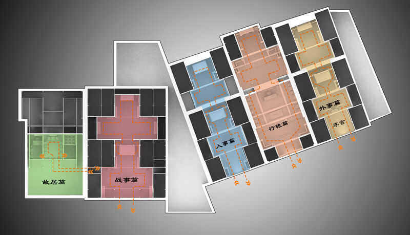 整館的平面布局將展示內(nèi)容集中到空間較為開闊的廳堂內(nèi),方便觀眾延順時(shí)針方向順次參觀,使展線更加流暢,承載信息量更大。