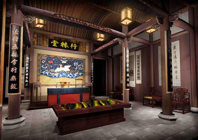行轅篇選擇了幾間大屋中比較開闊的承恩堂做陳列,在前廳中還原了曾國藩在祁門設(shè)立暫住地辦事處的場(chǎng)景。包含了作戰(zhàn)沙盤,士兵雕塑和象征尚書文官等級(jí)的仙鶴奔月圖、帥案、字畫等重要元素點(diǎn)的陳列。