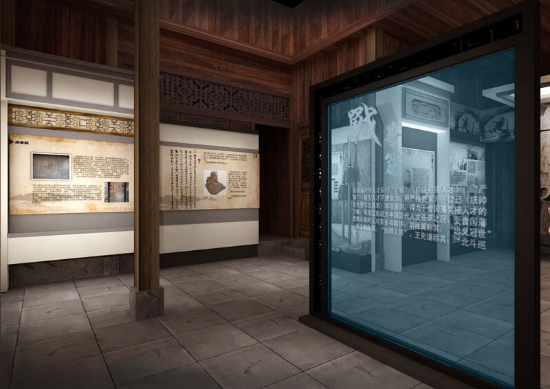 序言: 在整館的序言部分,將抽象元素和具象結(jié)構(gòu)相結(jié)合形成藝術(shù)化影壁墻,簡要概括展示了洪家大屋的地理位置和歷史文化。