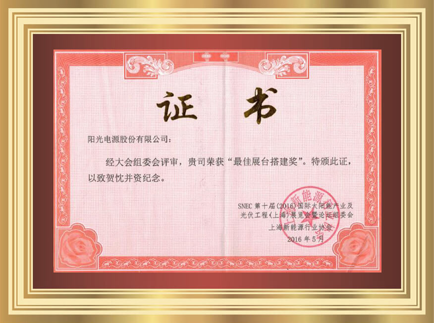 北京賽凡承接的陽光電源集團(tuán)展臺(tái)獲得了SNEC國(guó)際太陽能產(chǎn)業(yè)及光伏工程(上海)展覽會(huì)“最佳展臺(tái)搭建獎(jiǎng)”。
